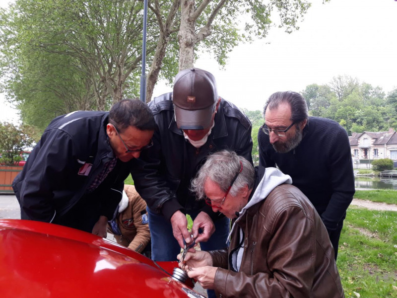 Un appel à St Christophe et la voilà partie toute fière sur les petites routes. Comme d’habitude elle lézarde, elle se fait attendre…Elle arrive enfin au départ de la balade et là, Oups !!! un petit caprice non pas de la voiture mais de son propriétaire qui s’explique, s’excuse de son retard car il n’a pu mettre de l’essence la faute à la clé du bouchon réservoir. Comment ? Il ose imputer son retard à une petite clé anglaise ? Son manque de doigté lui a fait commettre une erreur impardonnable : il a cassé la clé. Donc… il faut retirer le petit bout coincé avec les moyens du bord !!!