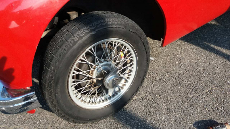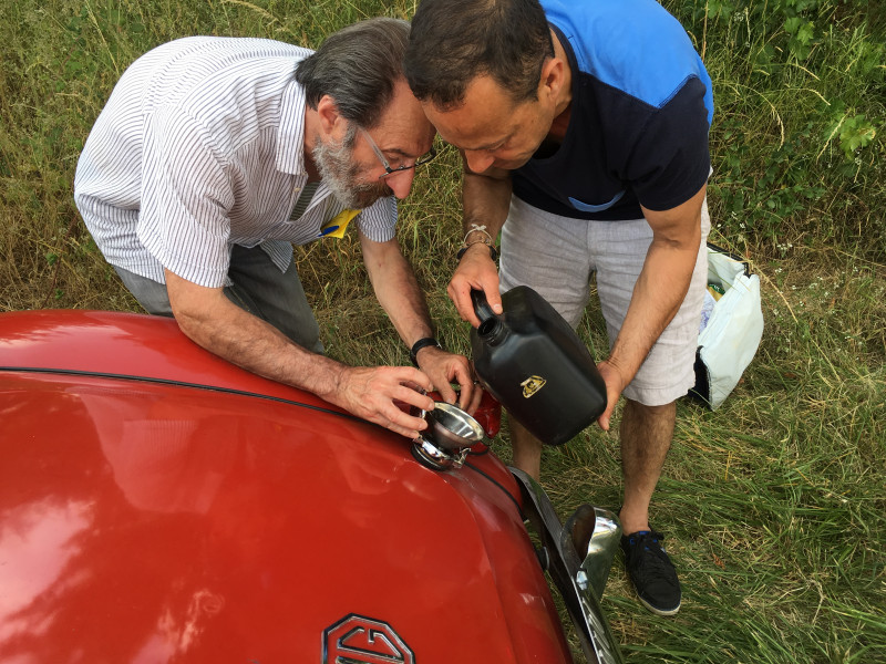 Sur la route une Jaguar et une TR3 voient deux énergumènes gesticulant sur le bas-côté de la route avec une petite voiture rouge qui fait grise mine !!! Notre petite voiture rouge a de petits problèmes !!! H. son propriétaire tête en l’air a oublié sa carte bancaire et n’a que 20 € sur lui. Il s’est dit « la balade est courte donc pas de problème ! Hélas, trois fois hélas il arrive ce qui devait arriver … la panne d’essence. La TR3  qui a du cœur  emmène H. qui, prévoyant, avait un bidon d’essence… vide le remplir à la station la plus proche.